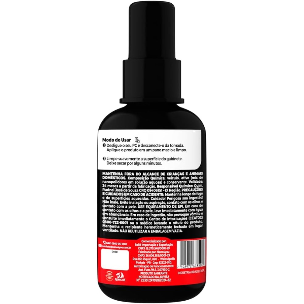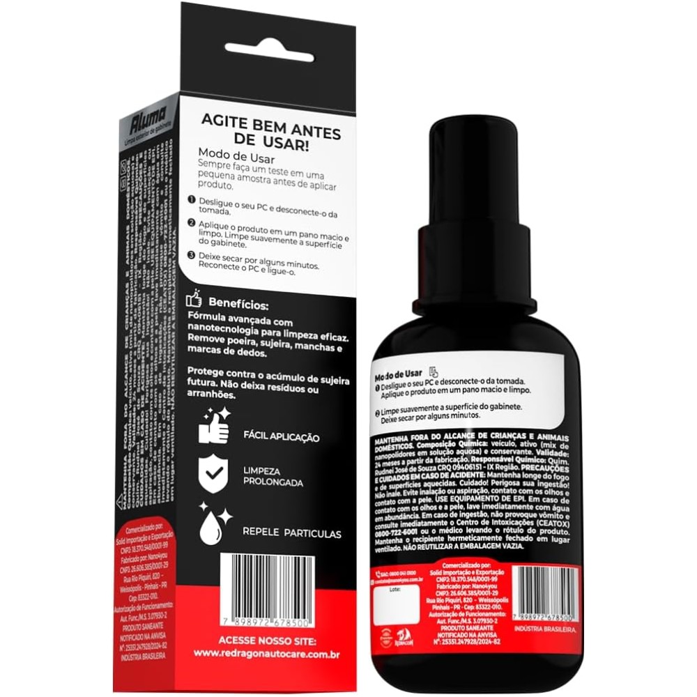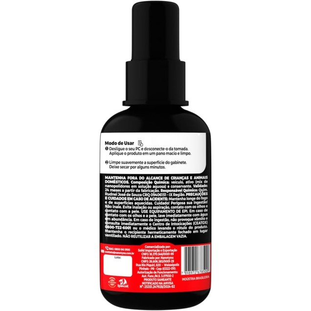 - Modo de Usar: AGITE BEM ANTES DE USAR! 1.Desconecte o computador da parede, pressione de 2 a 3 vezes para que o computador ligue e dissipe o restante de energia. Agite o produto e aplique uma pequena quantidade do produto em um pano microfibra. Não aplique diretamente no gabinete para evitar que escorra nos componentes internos. 2.Limpe o gabinete usando movimentos suaves e circulares. Use o lado seco do pano para remover qualquer excesso. 3. Aguarde a secagem completa e reconecte o PC.