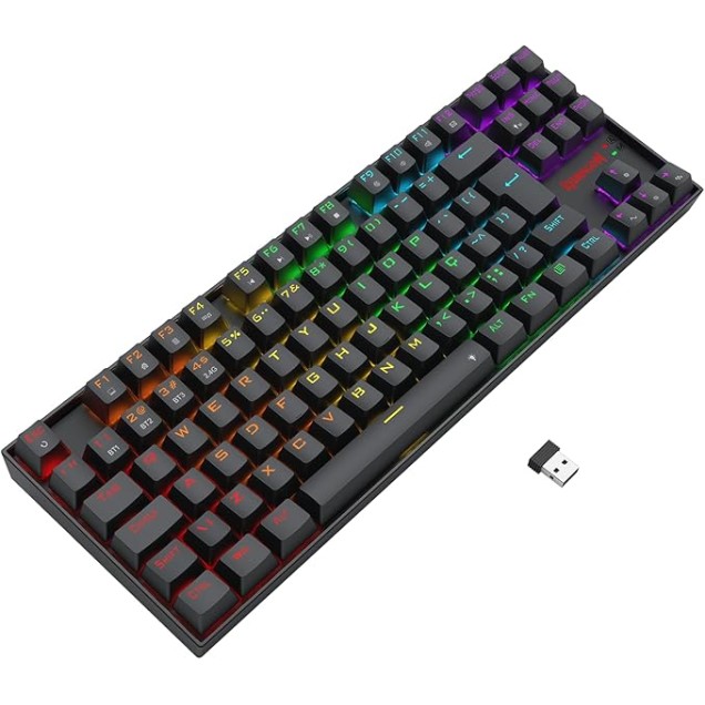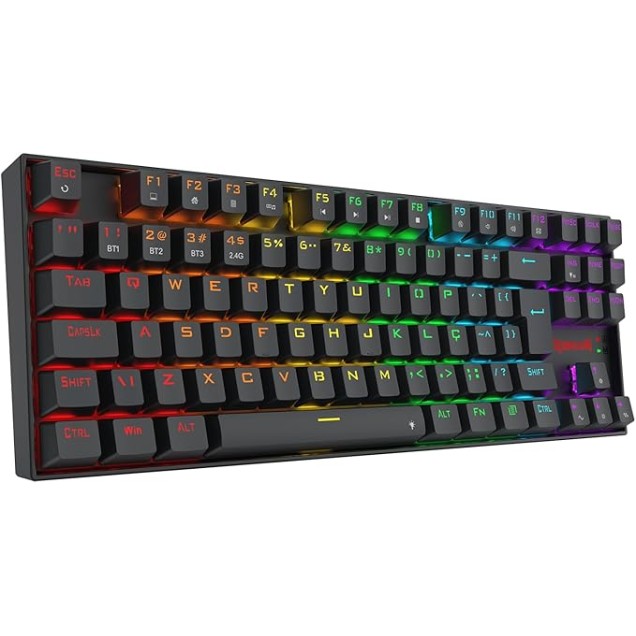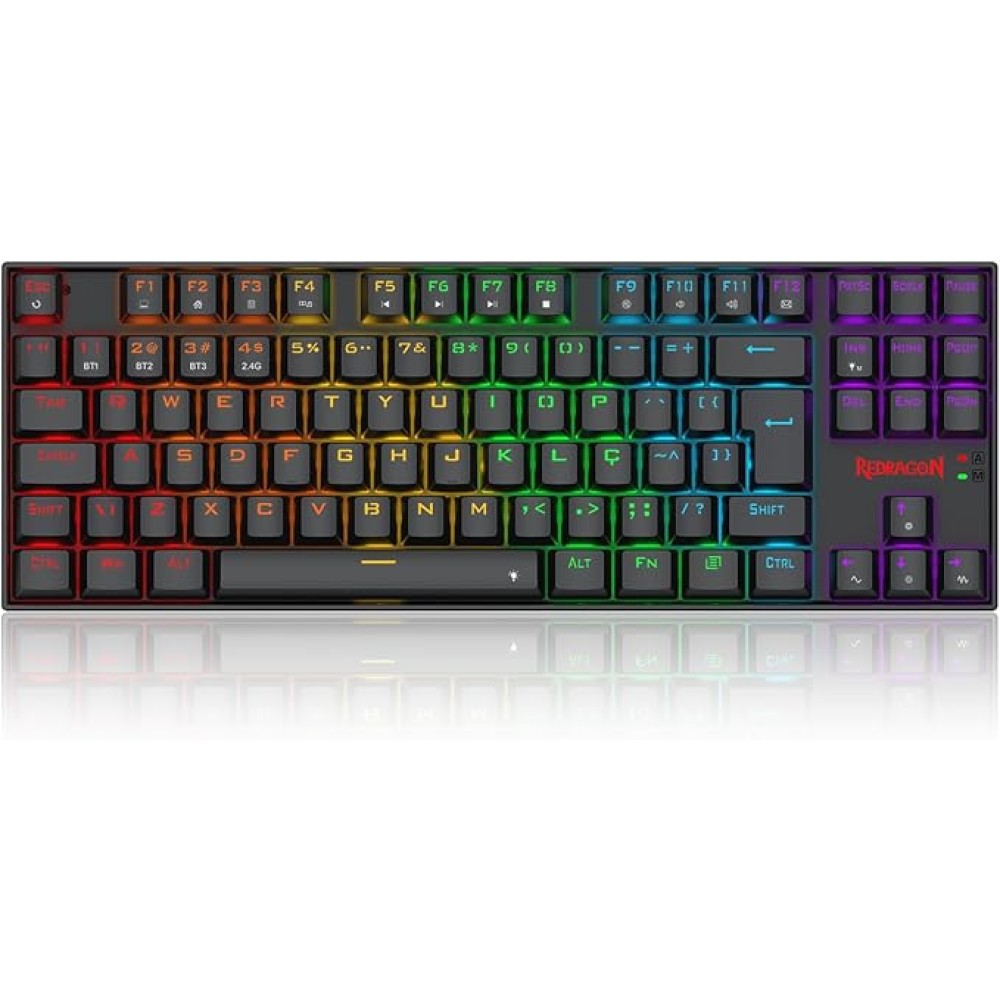 Características: - Teclado com formato TKL compacto proporcionando mais espaço para o mouse - Iluminação Rainbow trazendo mais brilho para seu setup - Layout ABNT2 feito especialmente para o mercado brasileiro - Keycaps feitas com o método doubleshot injection resultando em legendas duradouras - Atalhos multimídias integrados as teclas F para ajustes rápidos e práticos Especificações: Switches: Redragon Azul Acionamento: Mecânico Hotswap DIY: Sim COR: Preto Formato: TKL Estrutura: Tray mount Design: Teclas Flutuantes Layout: ABNT2 Conectividade: USB Tipo-C, Bluetooth, USB 2.4GHz Software: Sim Altura Ajustável: Sim Materiais do case: Plástico ABS Iluminação: Rainbow Rollover: N-key Comprimento do cabo: 1.5m Keycaps: Doubleshot Capacidade da bateria: Dimensões aproximadas do produto: 354 x 124 x 36 mm Peso aproximado do produto: 602 g Anatel: 02981-24-16556 Peso da embalagem: Bruto (g): 863 Líquido (g): 800 Dimensões: Embalagem: 40 x 370 x 150 mm